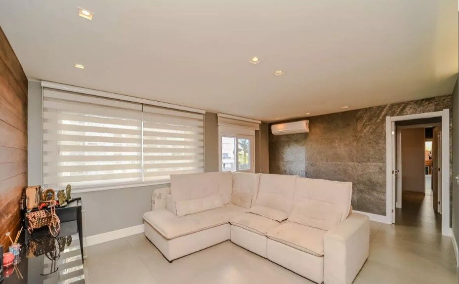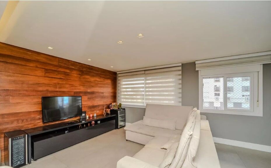 Imóvel de três dormitórios, transformado em 2, com living estendido. O apartamento foi reformado com colocação de porcelanato em todo o apartamento e foram trocadas as pias e louças dos dois banheiros, pia da cozinha, com colocação de pia com duas cubas e troca do tanque original, ficam no apartamento os aparelhos de ar condicionado, sendo um em cada quarto e um na sala.